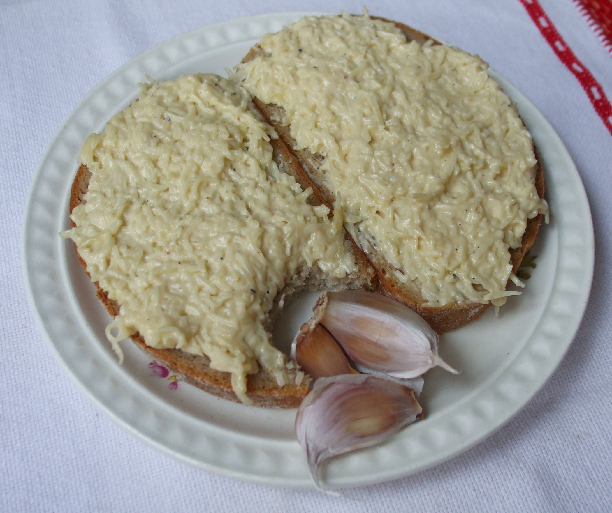 Sýr nastrouháme a smícháme s česnekem rozetřeným se solí a pepřem a také s majonézou. Česneková pomazánka je pak výborná zejména na jednohubky.