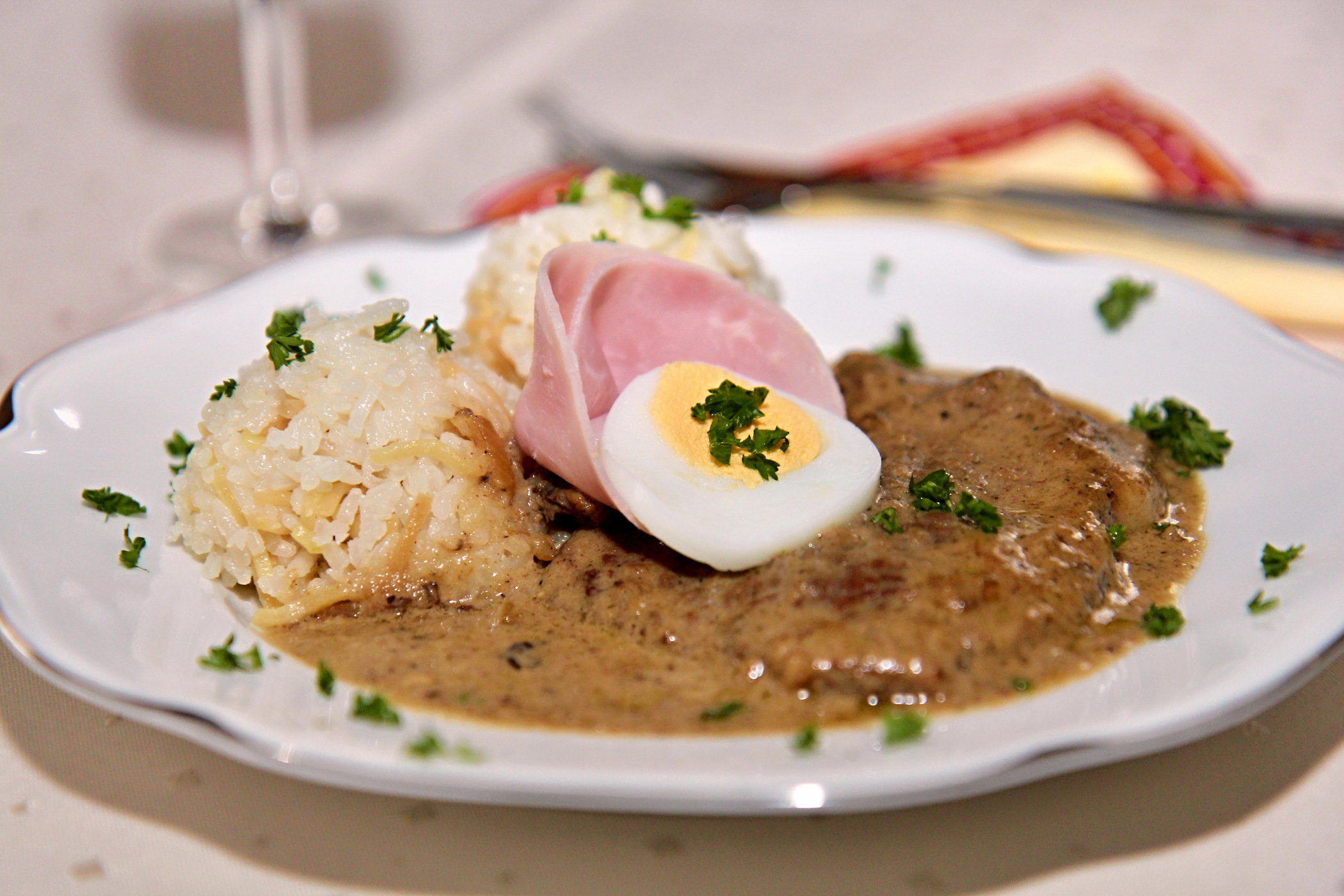 Při podávání maso podlijeme omáčkou a ozdobíme kornoutky ze šunky, plátky vařených vajec a petrželkou.