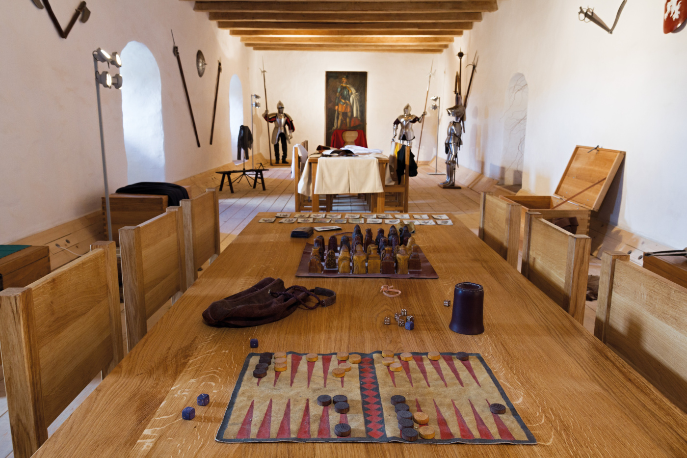 Několik schodů dovede návštěvníky k historickým dveřím do hlavního sálu. Samotný prostor vypadá, jakoby odtud jen před chvílí odešli zbrojnoši. Uprostřed místnosti jsou dřevěné stoly, na nich historické hry, karty, šachy nebo vrhcáby, ale i oděvy. Stěny lemují truhlice. Zdi zdobí historické zbraně z konce patnáctého a počátku šestnáctého století, v sále nechybí ani brnění nebo malé dělo.