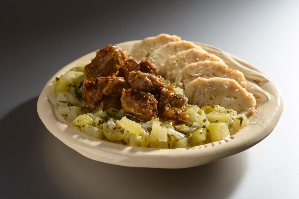 Příloha: houskové knedlíky, vařené brambory, rozpeky nebo slané pečivo