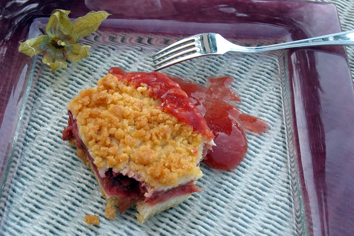 Na vychladlý korpus stejnoměrně naneseme rebarborový krém a celý povrch polijeme želatinou, připravenou podle návodu na sáčku. Když želatina ztuhne, nakrájíme na porce. Na závěr můžeme koláč ozdobit ušlehanou šlehačkou.