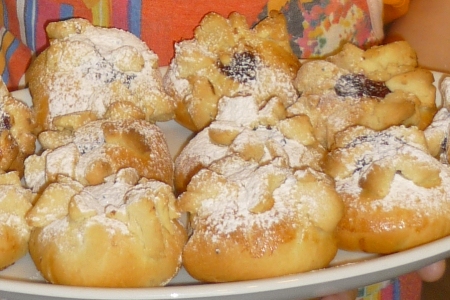 Na náplň: 2 kostky tvarohu, 1 celé vejce, rozinky, cukr podle chuti, případně troška vanilkového pudinku na zahuštění (není nutné)