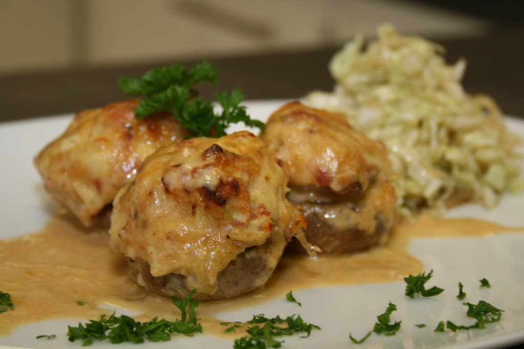 Jablka i hrušky oloupeme, odstraníme jádřince a nakrájíme je na tenké plátky. V kastrolu rozehřejeme máslo a plátky ovoce krátce podusíme. Poté zalijeme smetanou, přidáme zbytek hořčice, šťávu z pečeně, ochutíme vegetou a povaříme 5 – 10 minut. Maso nakrájíme na plátky a přelijeme omáčkou a obložíme plátky ovoce. Vhodnou přílohou jsou vařené široké nudle, nejlépe domácí.