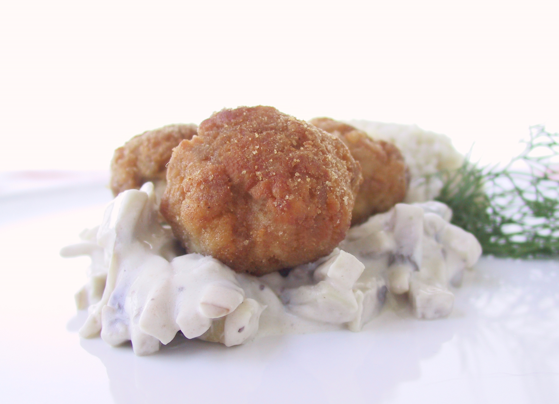 Mleté maso dáme do mísy, osolíme, opepříme, přidáme vymačkané, najemno nastrouhané syrové brambory, bramborový škrob, najemno nakrájenou cibuli, kapary, žloutky, mléko a dobře promícháme. Podle potřeby směs zahustíme strouhankou. Mokrýma rukama tvoříme kuličky velikosti pingpongového míčku, které smažíme v rozpáleném oleji. Osmažené kuličky odložíme na teplém místě. Do nepřepáleného výpeku nalijeme trochu vody, přidáme bujónovou kostku a krátce povaříme. Nakonec přidáme najemno nakrájenou okurku, zalijeme smetanou a omáčku prohřejeme. Osmažené kuličky podáváme přelité omáčkou, nejlépe s vařenými bramborami a brusinkovým kompotem.