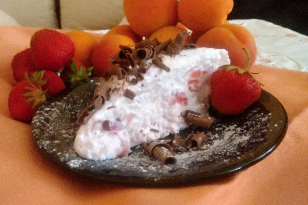Jahody omyjeme a na sítu je necháme řádně okapat. Jogurt, zakysanou smetanu, cukr, rum a na kousky nakrájené jahody promícháme a nakonec vmícháme dotuha ušlehanou smetanu (šlehačku). Želatinu nebo ztužovač připravíme podle návodu a rychle, ale opatrně vmícháme do připravené směsi, kterou vlijeme do formy (nebo jiného tvořítka) vyložené mikrotenovou folií. V chladničce necháme ztuhnout alespoň 3 hodiny, nejlépe přes noc.