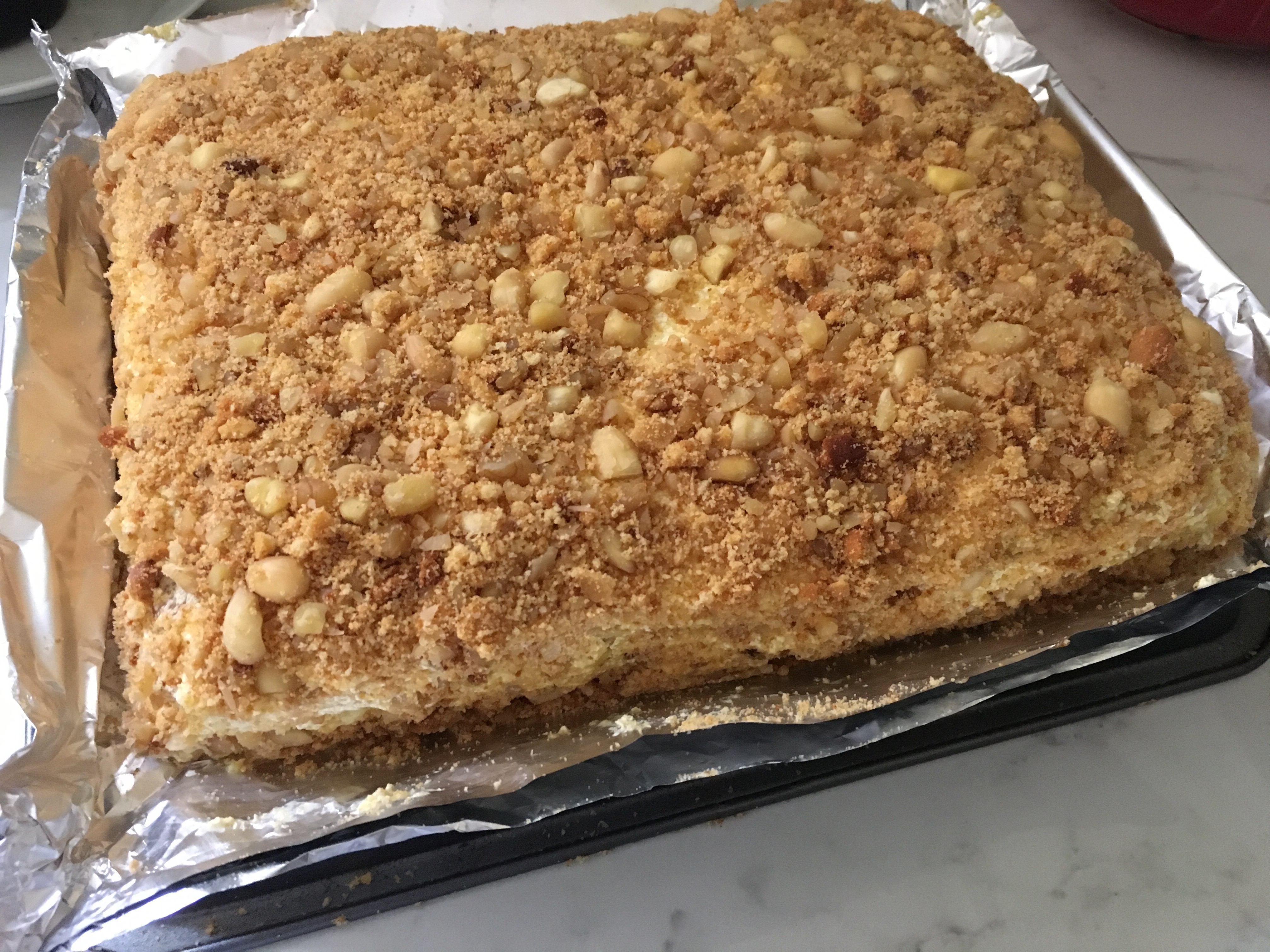 5. Na závěr potřeme i vrchní plát, na které nadrobíme drobečky z odřezků smíchané s ořechy.