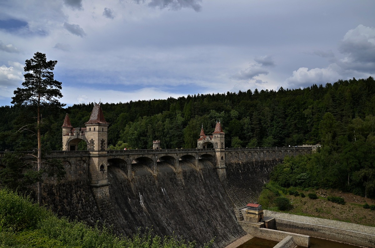 Romantická stavba kamenné hráze s průjezdnými branami zdobenými věžičkami uprostřed rozlehlých lesů v okolí Dvora Králové nad Labem zaujme snad každého. I toho, komu technické stavby celkem nic neříkají. Vždyť tenhle skvost připomíná spíš zámek než vodní dílo, které mělo zadržet vodu při povodních.