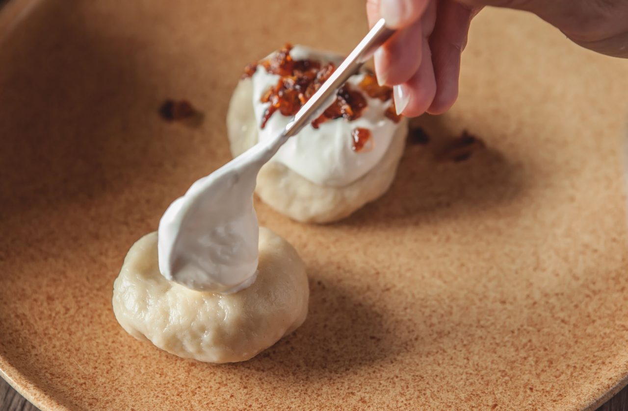 Knedlíky podáváme ozdobené kysanou smetanou a posypané orestovanou cibulkou.