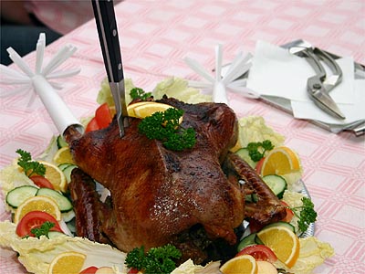 Měkkou, do zlatova upečenou husu, necháme chvíli „vydýchat“, pak ji naporcujeme a podáváme.