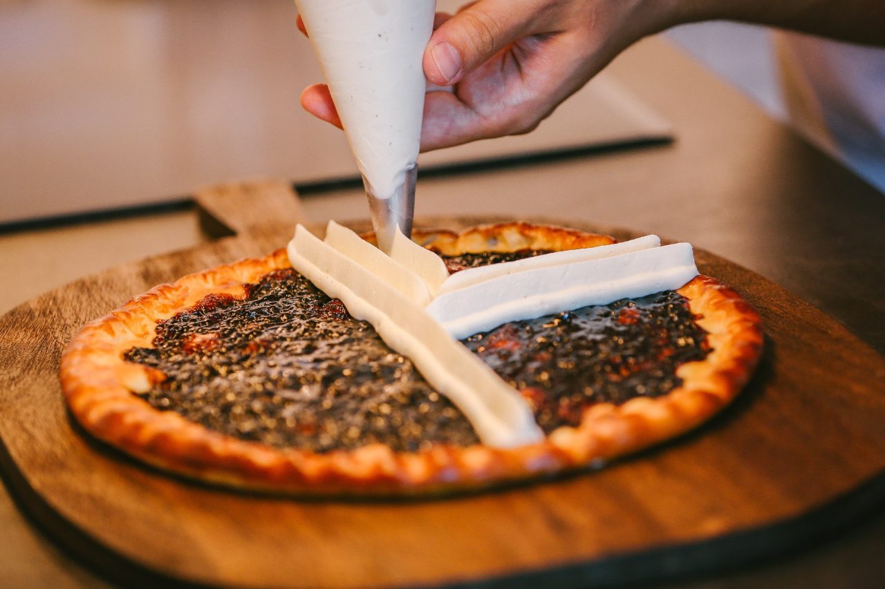 Merhovaný koláč může někomu snadno připomenout dětství. Tenká vrstvička kynutého těsta, povidel a navrchu ganache s chutí pribináčku a bílé čokolády. Tenhle famózní koláč je nekorunovaným králem letošního posvícenského pečení. „Je to moderní twist klasického chodského koláče,“ říká Vojta Vrtiška.
