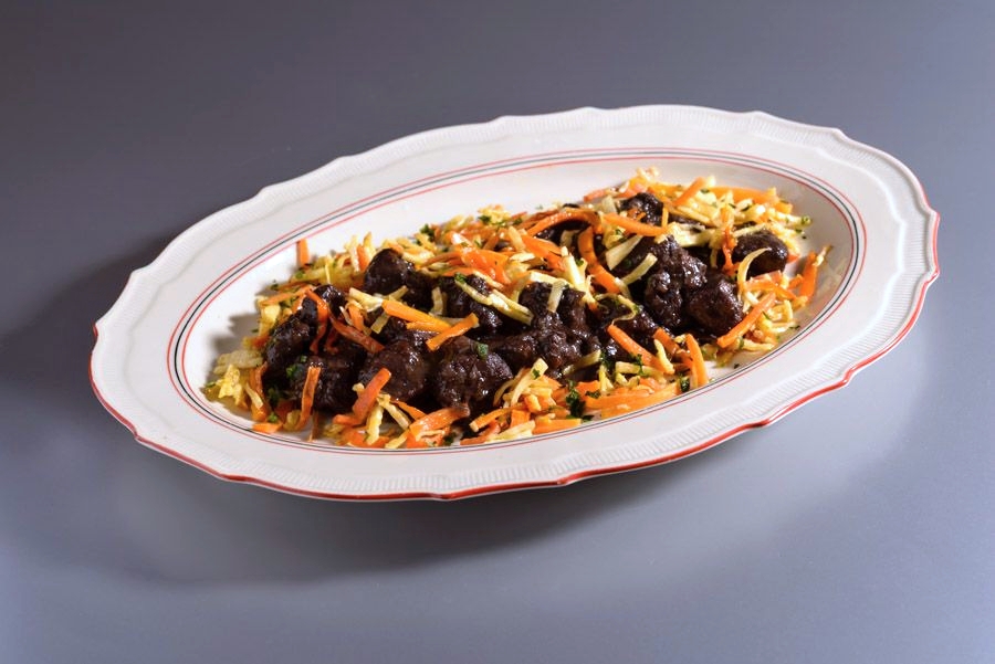 V kastrolu rozpálíme olej a polovinu másla a připravené maso zprudka opečeme. Přidáme nakrájenou cibuli, koření, zalijeme vínem, promícháme a pod poklicí dusíme doměkka. Podle potřeby podléváme.
