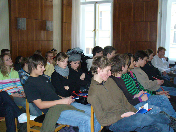 Vyslechli rozhlasovou hru mladého autora Davida Drábka Vykřičené domy. Hra měla premiéru loni v prosinci na stanici Vltava v rámci projektu Hra pro třetí tisíciletí (více o inscenaci na internetové adrese: http://www.rozhlas.cz/vltava/drama/_zprava/403321 .)