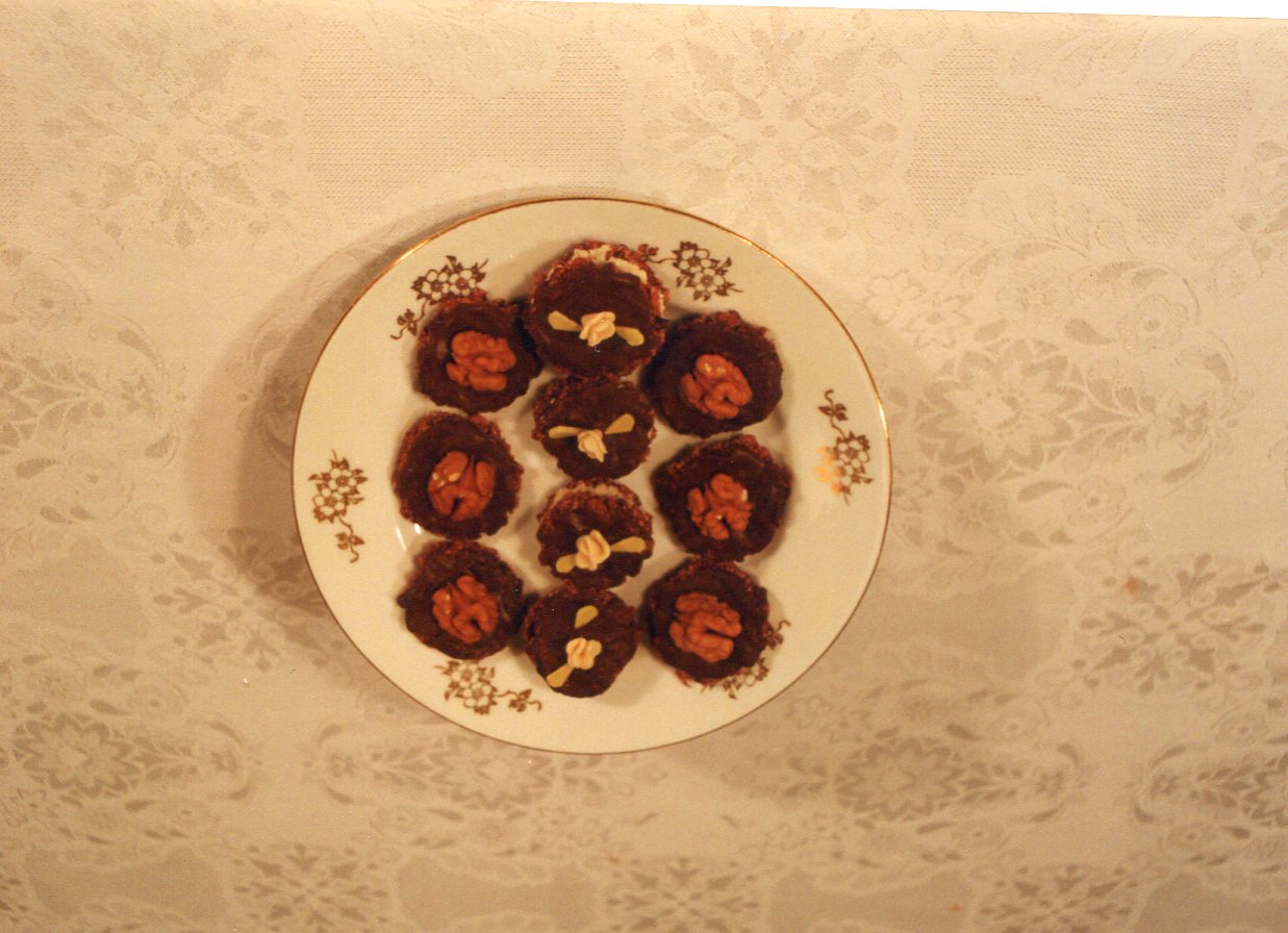 4. Po dosušení slepujeme třeba čokoládovo-ořechovou hmotou, poléváme čokoládou a zdobíme třeba ořechy nebo marcipánovými ozdobami.