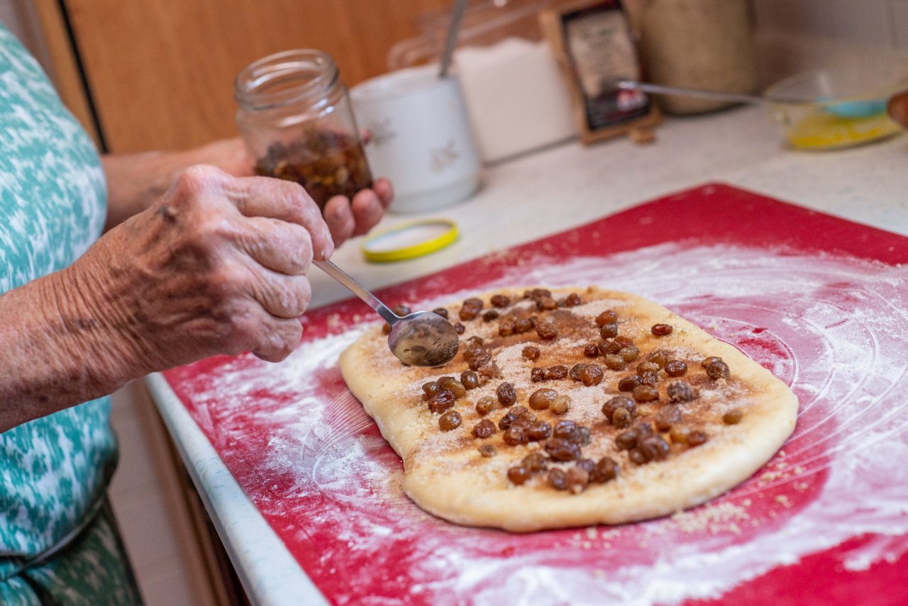 Vypadají jako smějící se prasečí rypáčky. Poctivě vypečené kynuté těsto nemá chybu. Nadýchané točence jsou sladké tak akorát, v ústech křupnou oříšky a rozinky s rumem dodají moučníku závěrečný šmrnc. Pekla Vlasta Kotrbová z Račiněvsi.