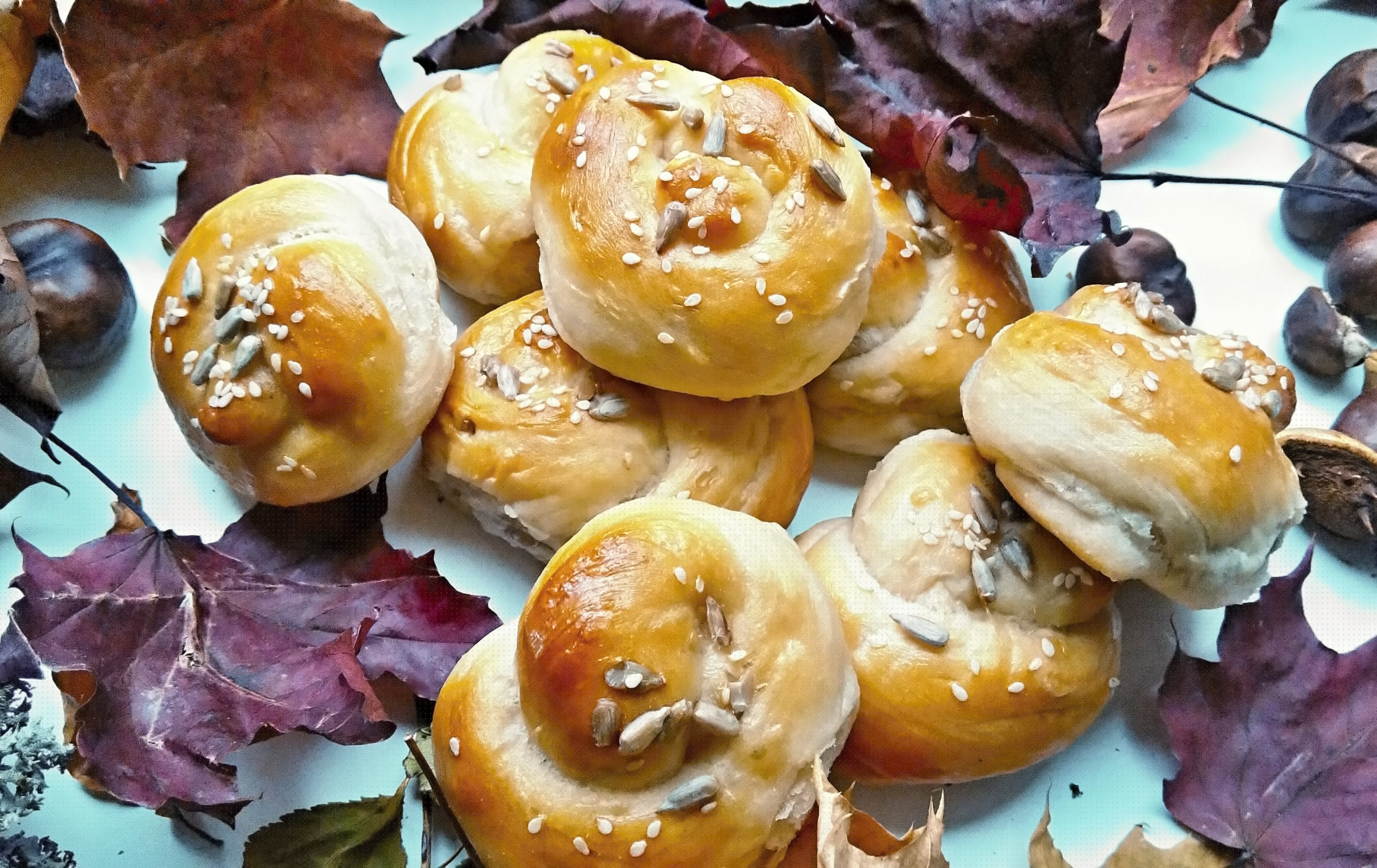 Potom je namažeme rozšlehaným vajíčkem a posypeme podle své chuti některými semínky. Pečeme ve středně vyhřáté troubě do zlatavého zabarvení.
