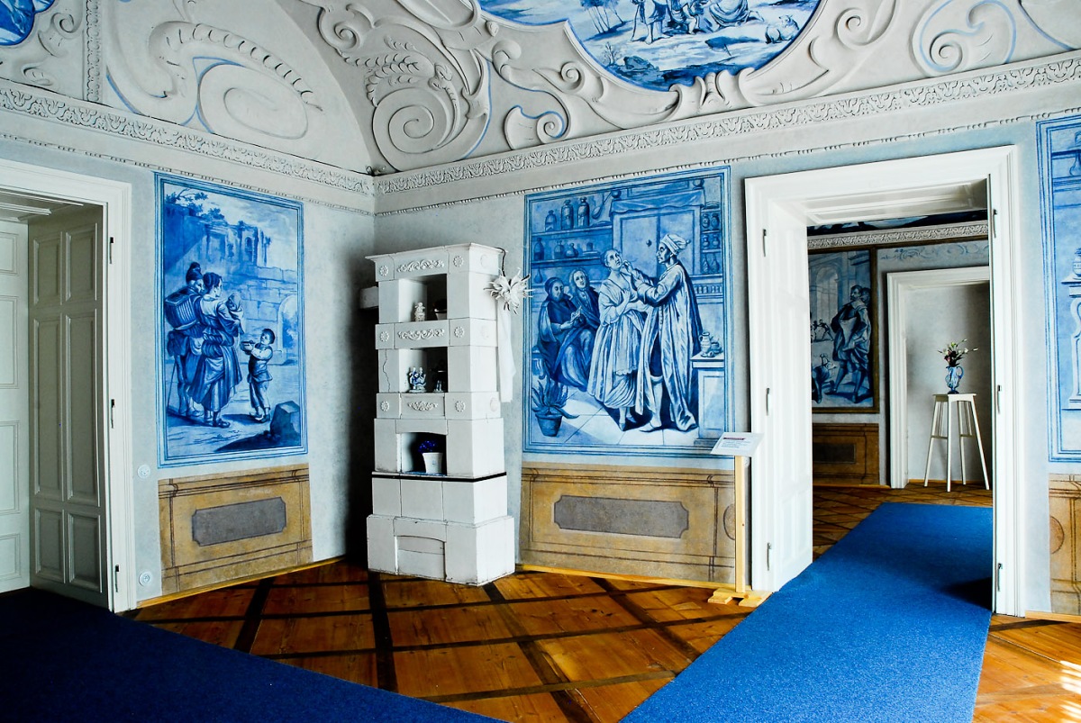 Skutečné šlechtické sídlo připomíná prostorná jídelna, do které majitelé umístili historický klavír Petrof z roku 1888 a luxusně naopak působí modré salonky s modrými freskami z konce 17. století, které se současným majitelům podařilo s přispěním různých dotací zcela zrenovovat.