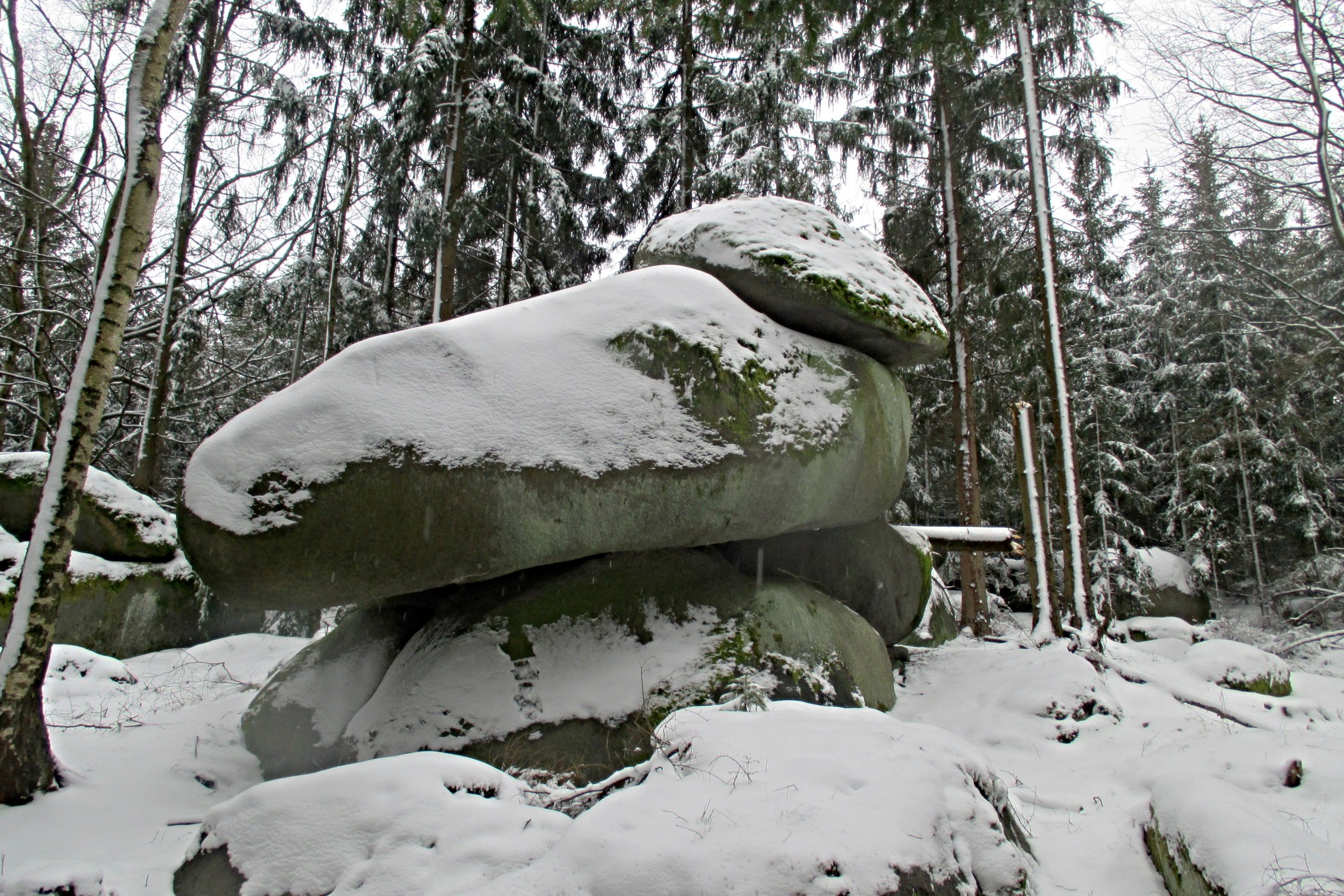 Žulový viklan jménem Viklan na severu Plzeňska vypadá v zimě jako sněhulák